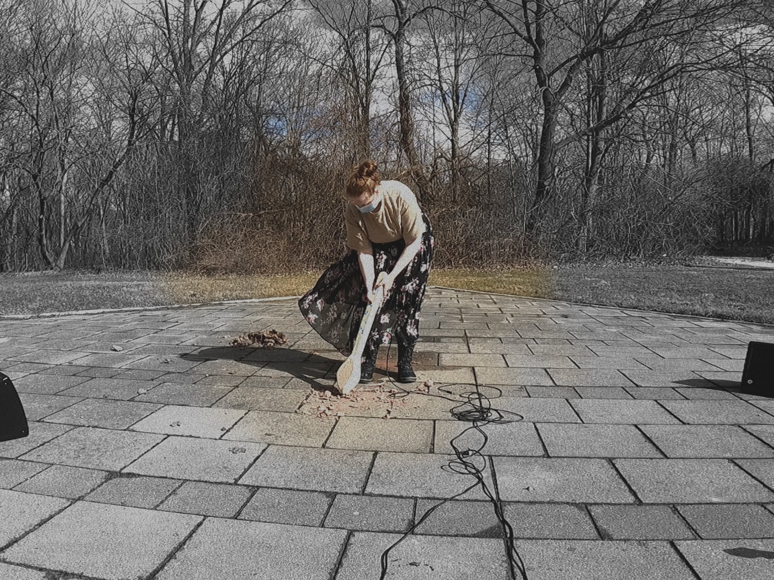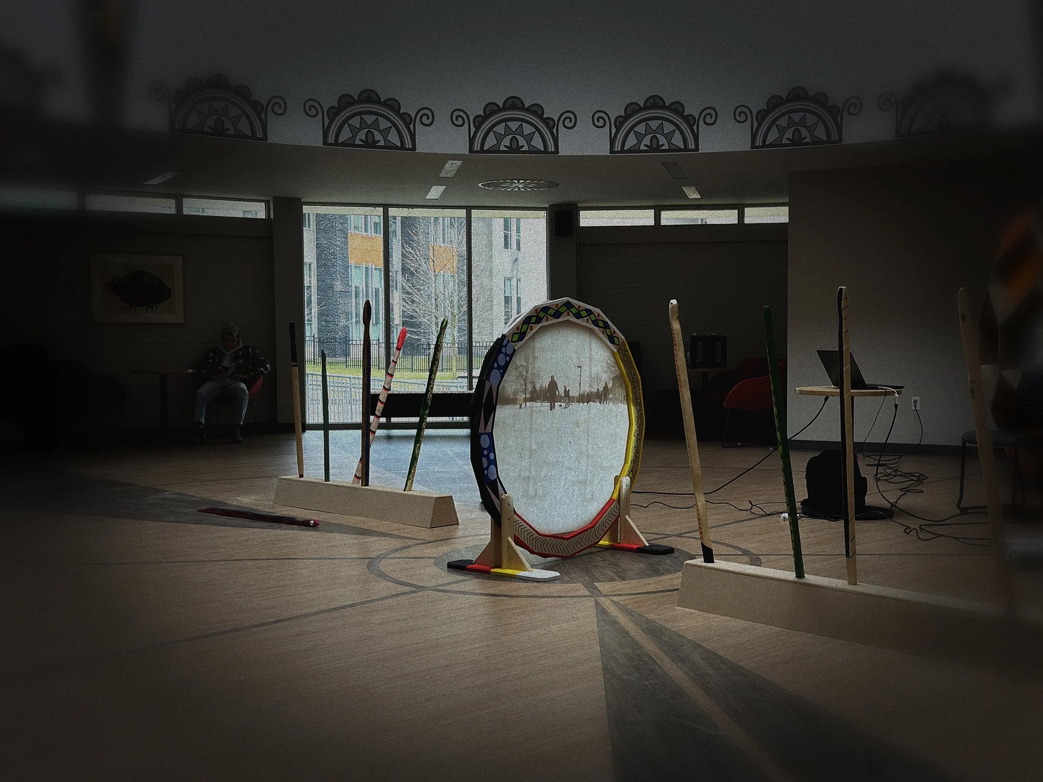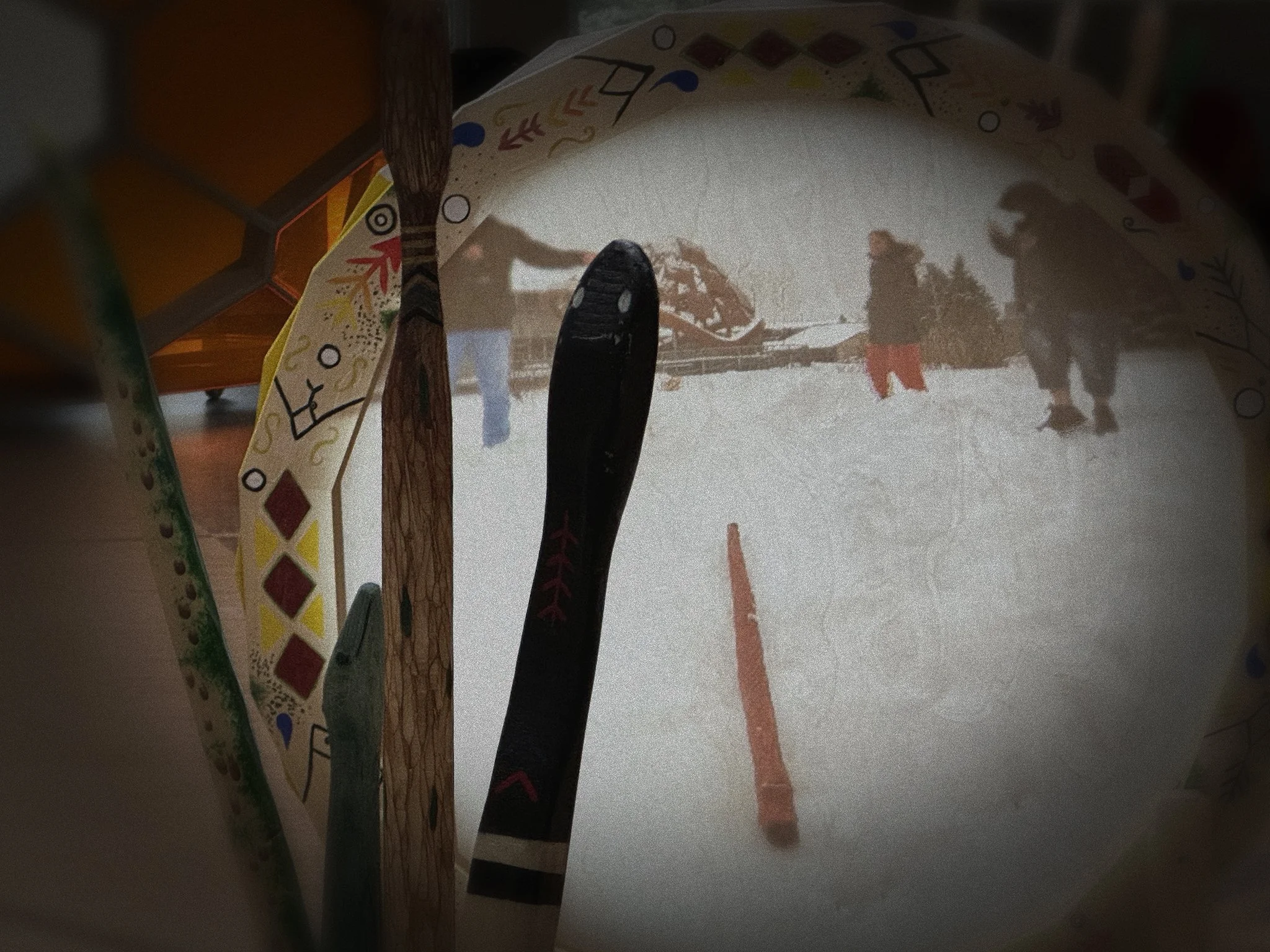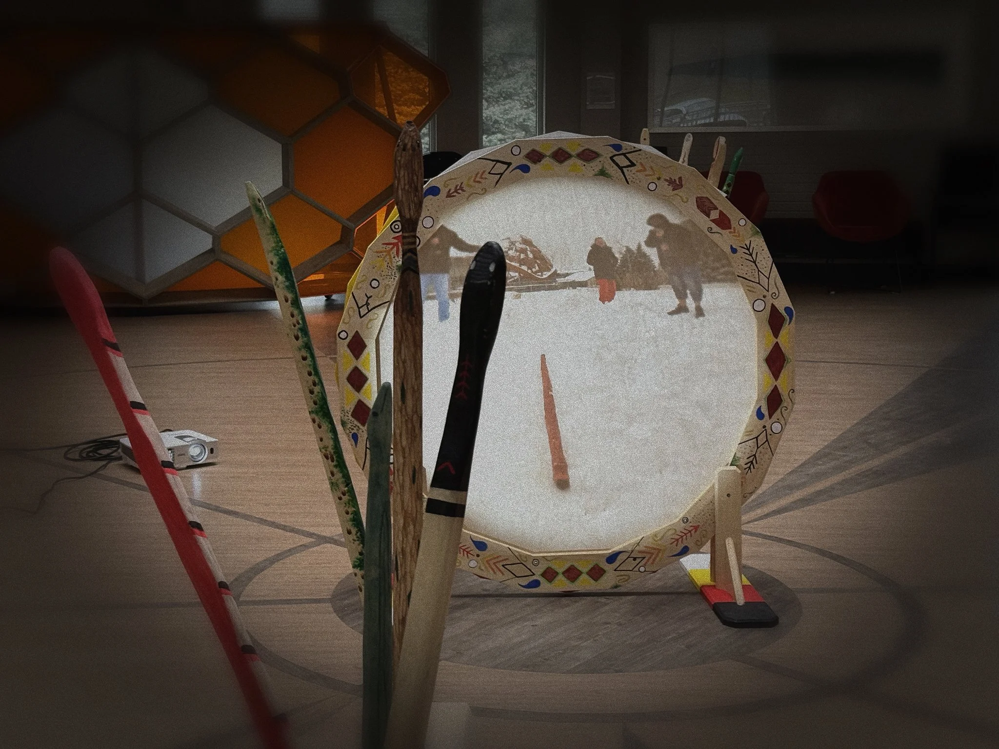 IMAGE (main): Landmarks Class Winter 2024 / Snow Snake Project / Multimedia Installation. IMAGE (left): Landmarks Class Winter 2024 / Turning of the Ashes /Interactive Sound Art Performances.